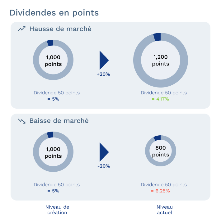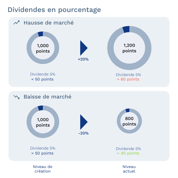 Les indices optimisés présentent eux un niveau de dividendes fixe exprimé soit en pourcentage soit en points. Ces deux types de dividendes ne représentent pas le même risque. Dans un marché baissier, un dividende en points va pénaliser la performance du sous-jacent davantage qu’un dividende en pourcentage. Ce sera l’inverse dans un marché haussier.