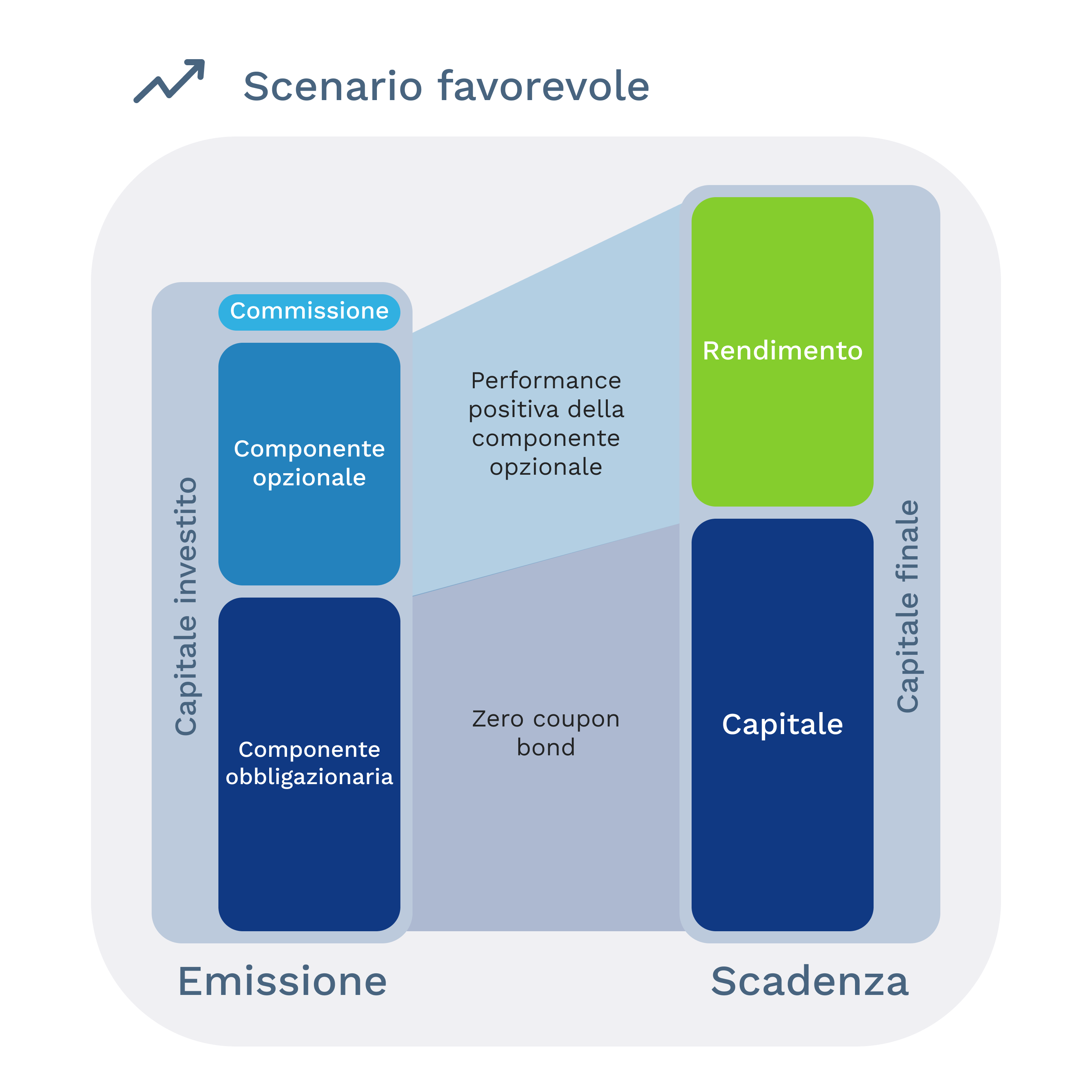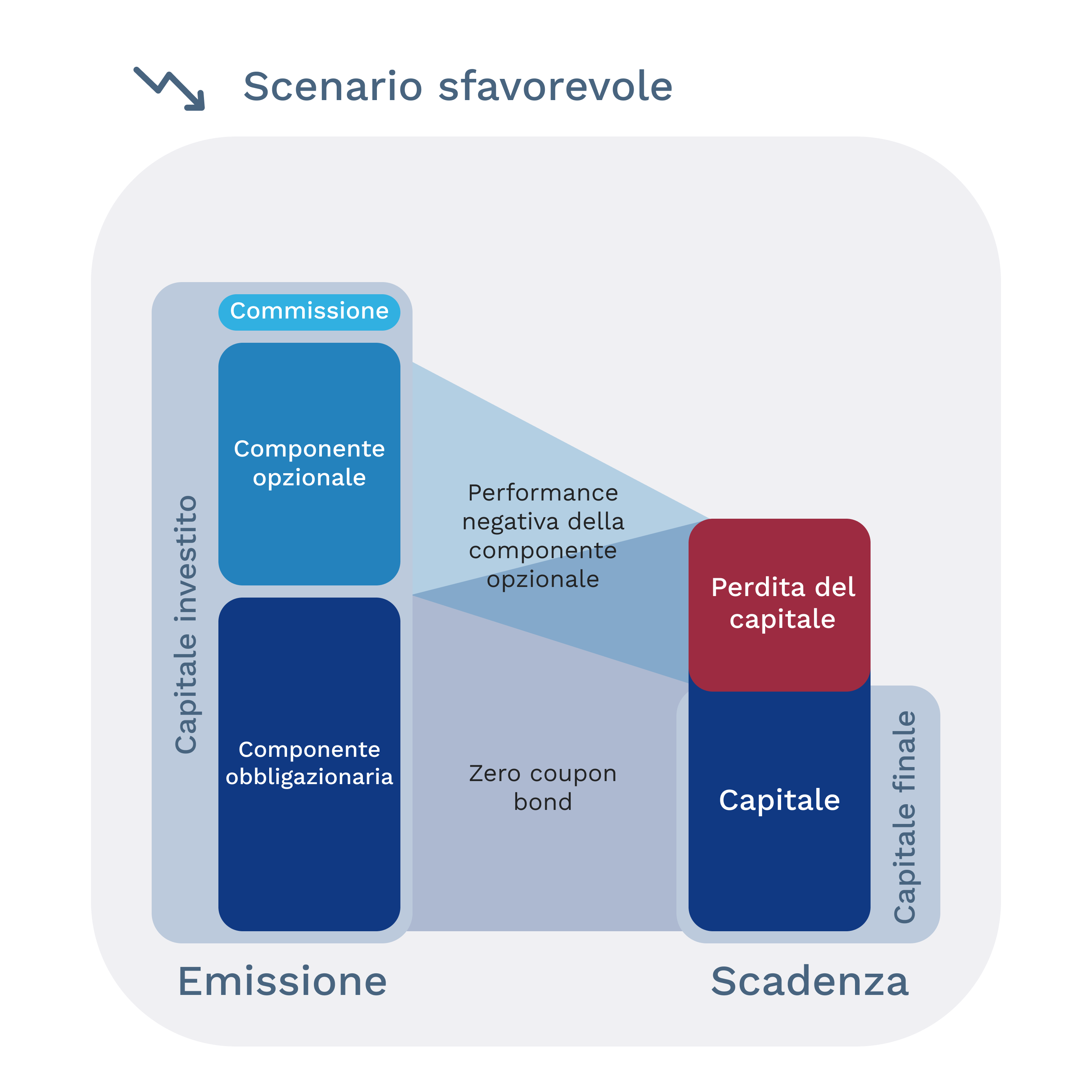 In caso di scenario sfavorevole, la componente opzionale può comportare una perdita parziale o totale del capitale investito, a seconda del rischio assunto al momento della sottoscrizione. In base al prodotto acquistato, l'intero capitale potrebbe quindi non essere protetto in caso di performance negativa del sottostante.